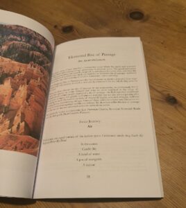 The original intention of the Book Project was to create a book based on the elements, which is why so many of the submissions are themed on fire, water, earth, or air. However, on reviewing the material I inherited, this ultimately did not work – although some submissions covered all the elements, the balance was heavily lopsided towards earth, and some submissions were of previously completed work and were unrelated. I therefore arranged it to have a beginning, middle, and end, with the various formats of essays, poems, ceremonies, and photographs evenly distributed in a complementary order.